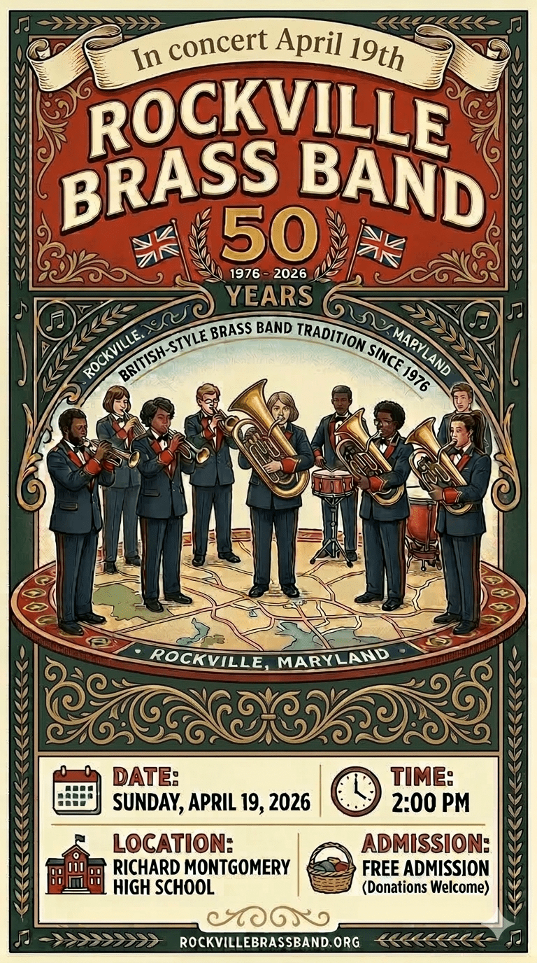 For more information, visit us at https://www.rockvillebrassband.org, on Facebook at @rockvillebb, and on YouTube at @rockvillebrassband8121.