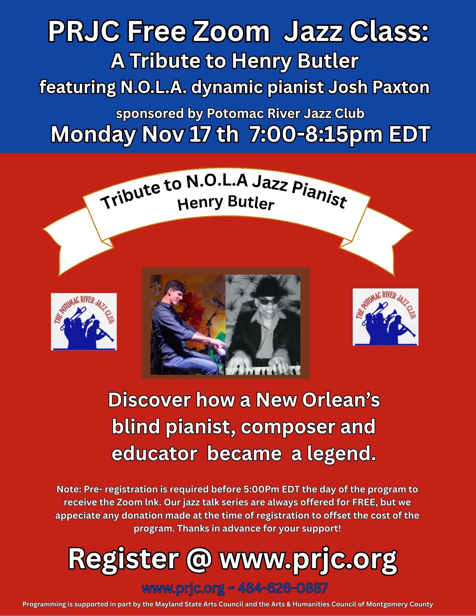 PRJC’ s November Zoom features a look at a New Orleans piano genius Henry Butler who Dr John once described as a “jellified piano plunker”. Sometimes, one musician said, Butler sounded like he was playing with three or four hands instead of two. Join Josh Paxton, an accomplished NOLA pianist himself, for more on musical legend Butler, a classically trained performer who went on to set new standards in funk, R & B, and blues.