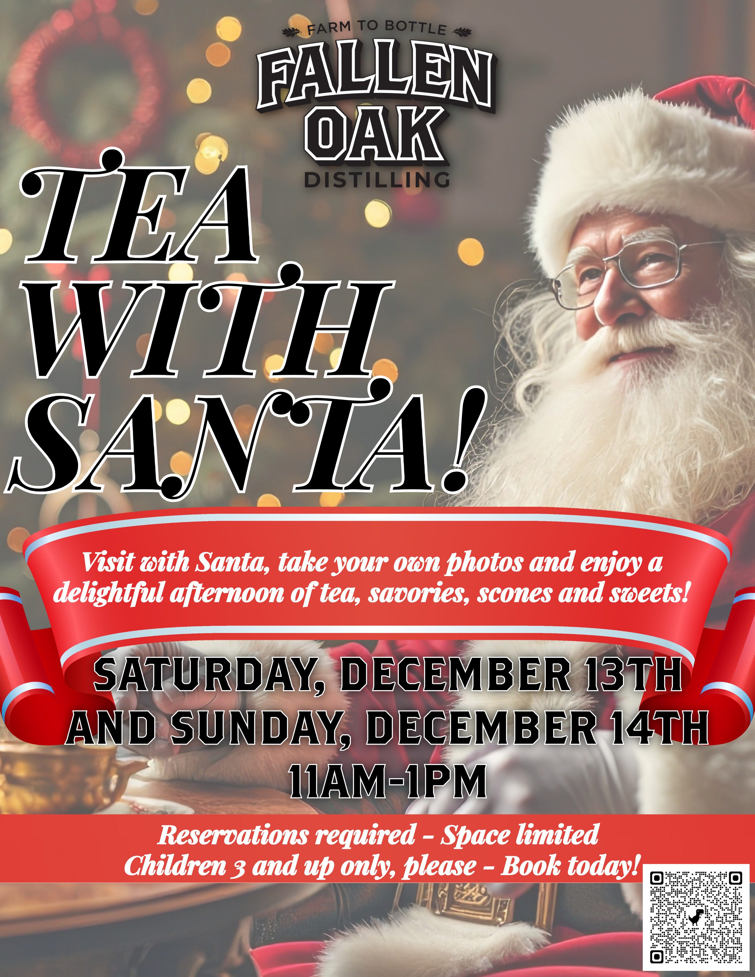 TEA AND PHOTOS WITH SANTA! Dec 13 2025 Dec 14 2025 Additional Dates Dec 13 2025, 11:00 am-Dec 14 2025, 1:00 pm FALLEN OAK DISTILLING THE WHISPERING SPIRIT SPEAKEASY 5000 Olney Laytonsville Road Montgomery County Maryland 20832 11:00 am 1:00 pm Visit with Santa, take your own photos and enjoy a delightful afternoon of tea, savories, scones and sweets in our beautiful speakeasy, decorated for the holidays! Reservations required – Space limited Children 3 and up only, please – Book today! Entertainment Food + Drink Holiday SeasonHoliday Event Website Audience Type: Family Friendly Ticket Link Map Directions Previous Related Listings Brewery Craft Beverage MoCo Eats Lone Oak Farm Brewing Company Holiday Drink Passport: Lone Oak has brewed an approachable Light American Lager using flaked rice, rather than the traditional corn Read more... 310 feet Loading... Related Listings FEATURED Brewery + Winery Outdoor Seating Tastemakers Trail Brewery Lone Oak Farm Brewing Company Lone Oak Farm Brewing Company is a nearly 30-acre property that boasts a taproom and porch, Snack Shack, three distinct Read more... 0 feet Favorite Loading... All Events Submit an Event