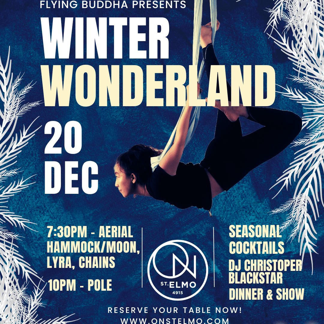 Step into an enchanted Winter Wonderland at ON St. Elmo. Enjoy a night of dinner, drinks, and dazzling performances as Flying Buddha’s students and teachers take the stage with aerial hammock, lyra, moon, chains, and pole routines that sparkle with grace, power, and festive flair.
