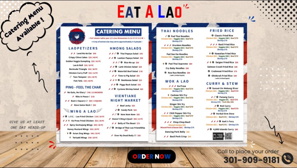 At Eat A Lao Restaurant, every dish is a heartfelt tribute to cherished family recipes passed down through generations, lovingly prepared to share the vibrant flavors and warm spirit of Laos and Thailand with our community. we bring the vibrant flavors of Laotian and Thai cuisine to Rockville, MD with heartfelt passion and authentic recipes.